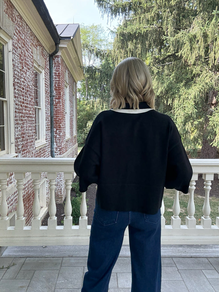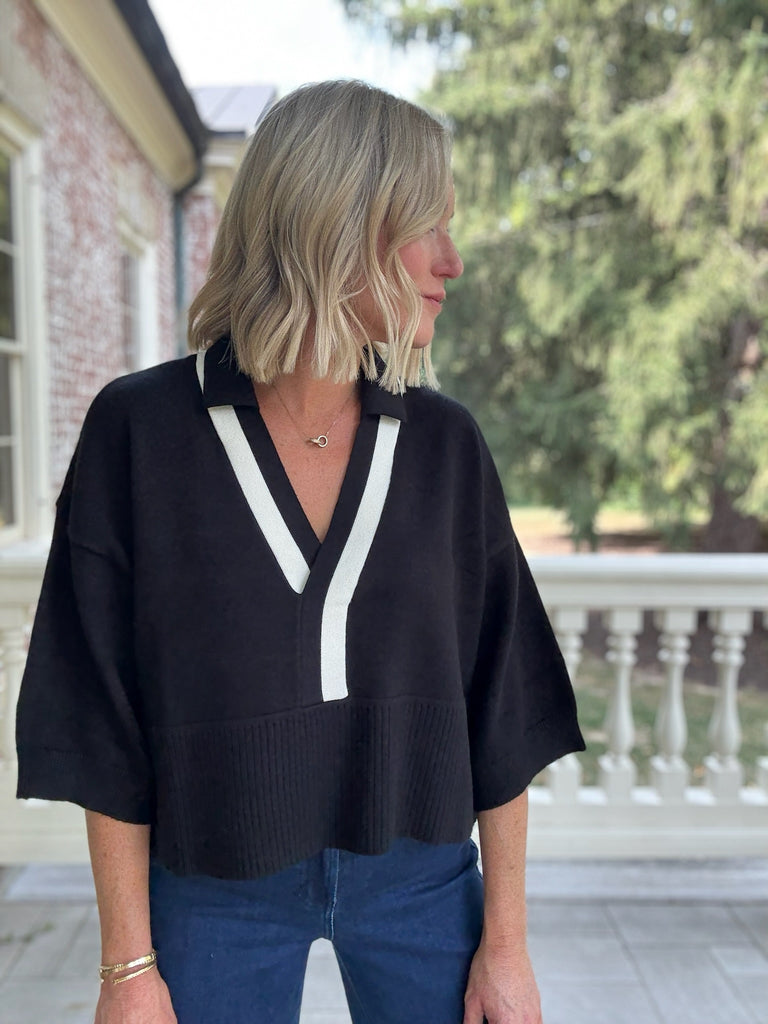 You can never go wrong with a black and white piece ad the Howard Top is sure to be your next favorite. This relaxed, oversized sweater top features short sleeves and v neckline with white accents.