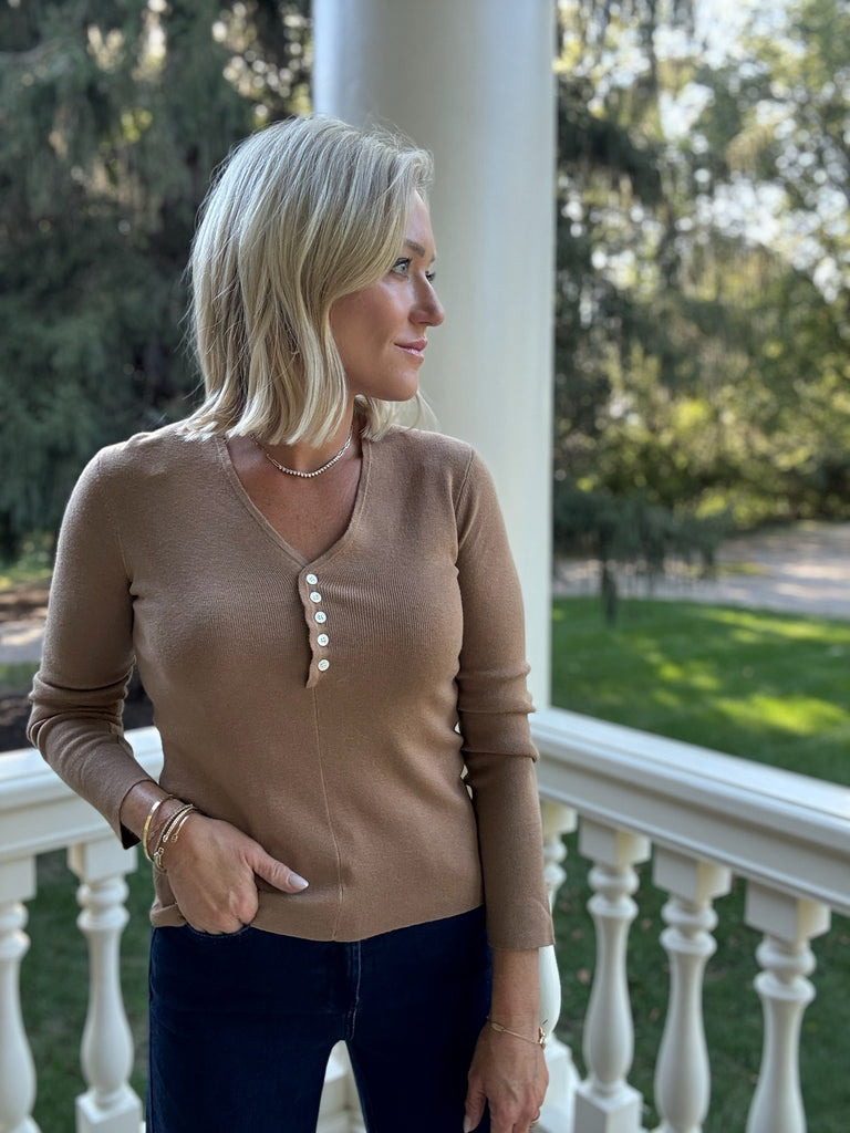 Your Fall layered look needs the Julieanne Button Knit Top! With its caramel colored fitted material, long sleeves and v button neckline this piece is so versatile.