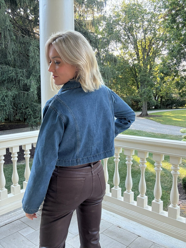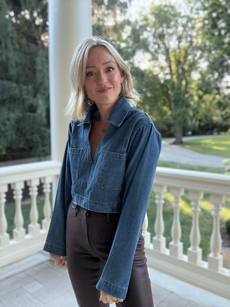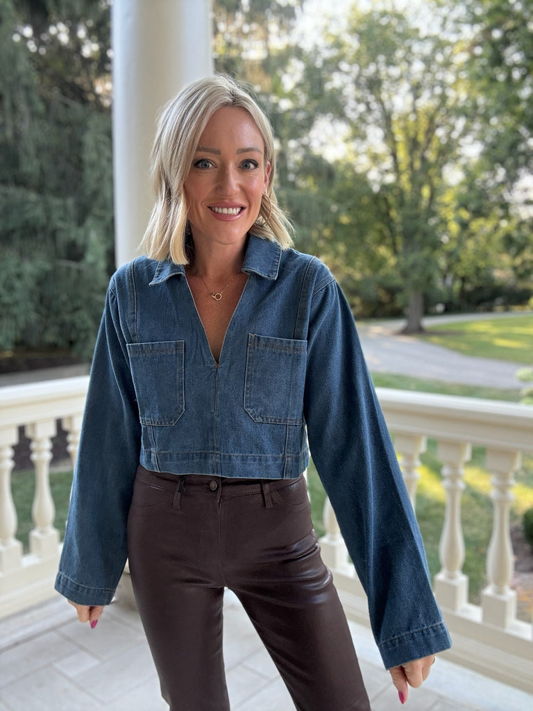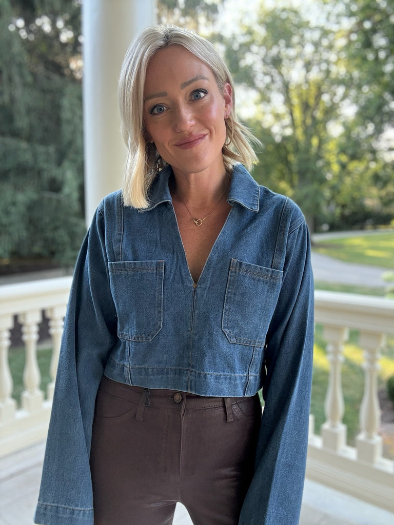 It's music festive season and the Margot Pocket Collar Top is the perfect addition to your concert fit! This denim cropped top features long sleeves, collard v neckline, and front pockets this piece will have you getting all of the compliments!