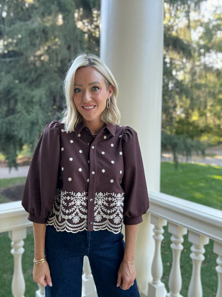 Take your simple brown look to the next level to with the Marlow Embroidered Puff Sleeve Top! Floral embroidered puff 3/4 sleeve button-down top featuring scallop accent hem. Button closure at front. Unlined. Woven. Non-sheer. Lightweight.