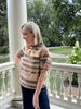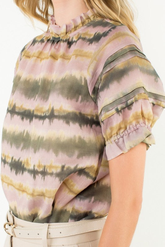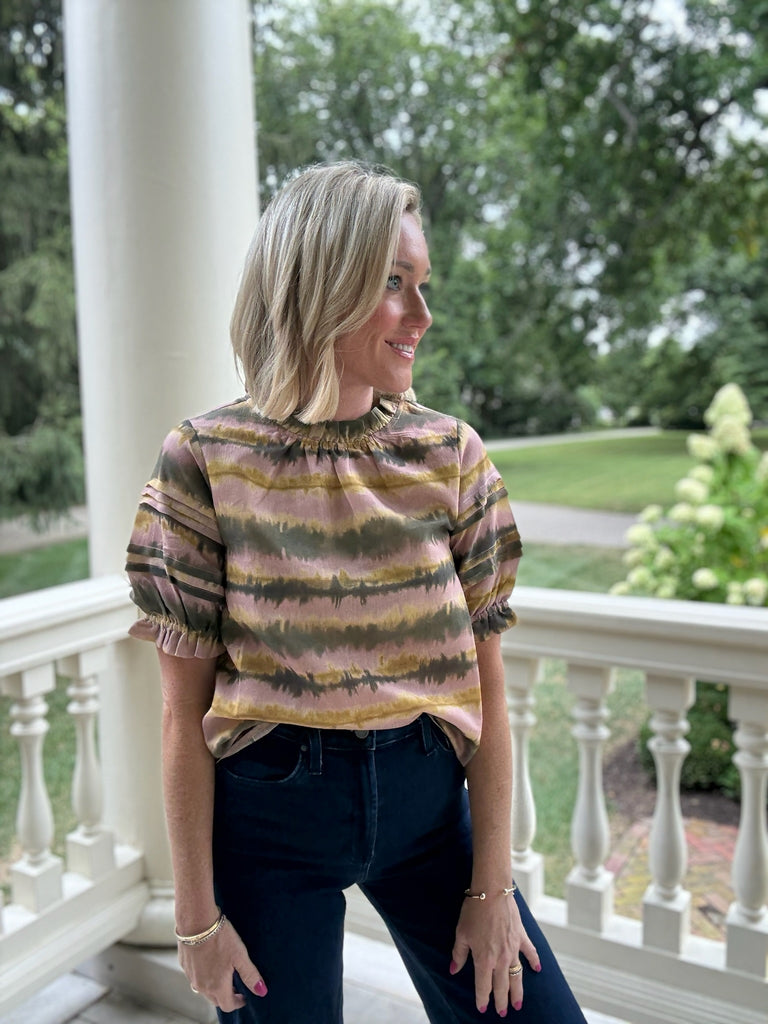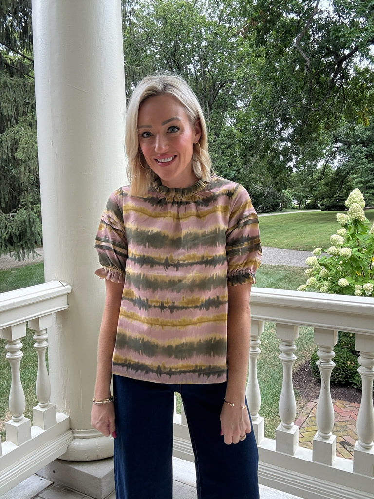 This unique print caught our eye at market, and we had to bring it back to you! With a stripe print in shades of green and tan, short puff sleeves, and ruffled high neckline, the Parker Top is a must have for Fall! Style with denim or khaki pants for a Fall ready look.