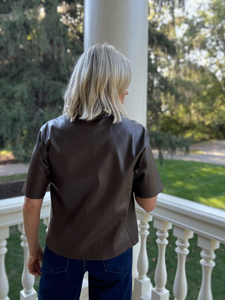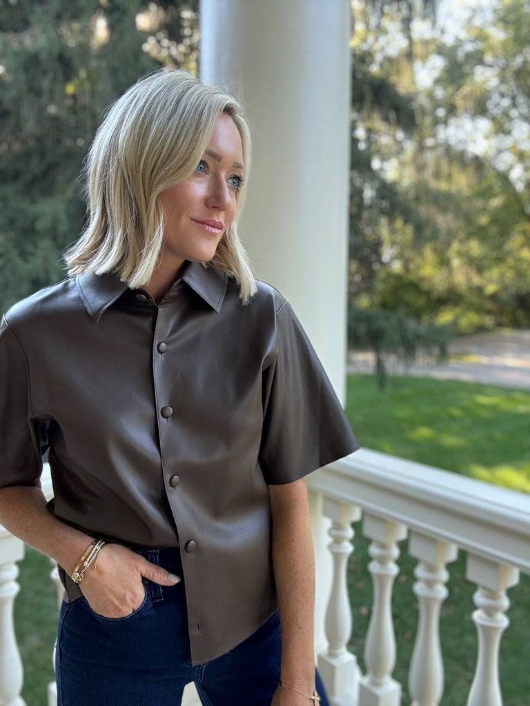 If you are loving the leather look, you need the Paulie Coated Button Top. This brown leather-style top features a collared neckline and front button closures. Wear open or closed to match any vibe.