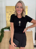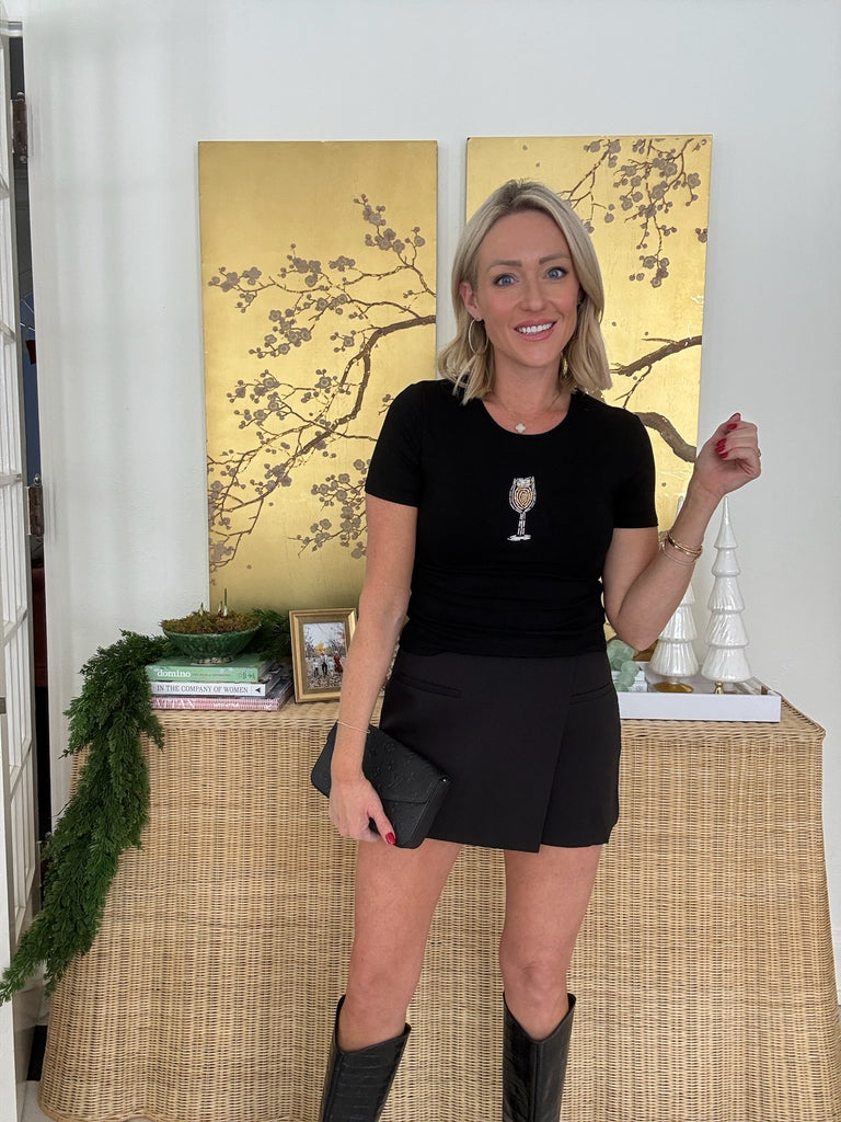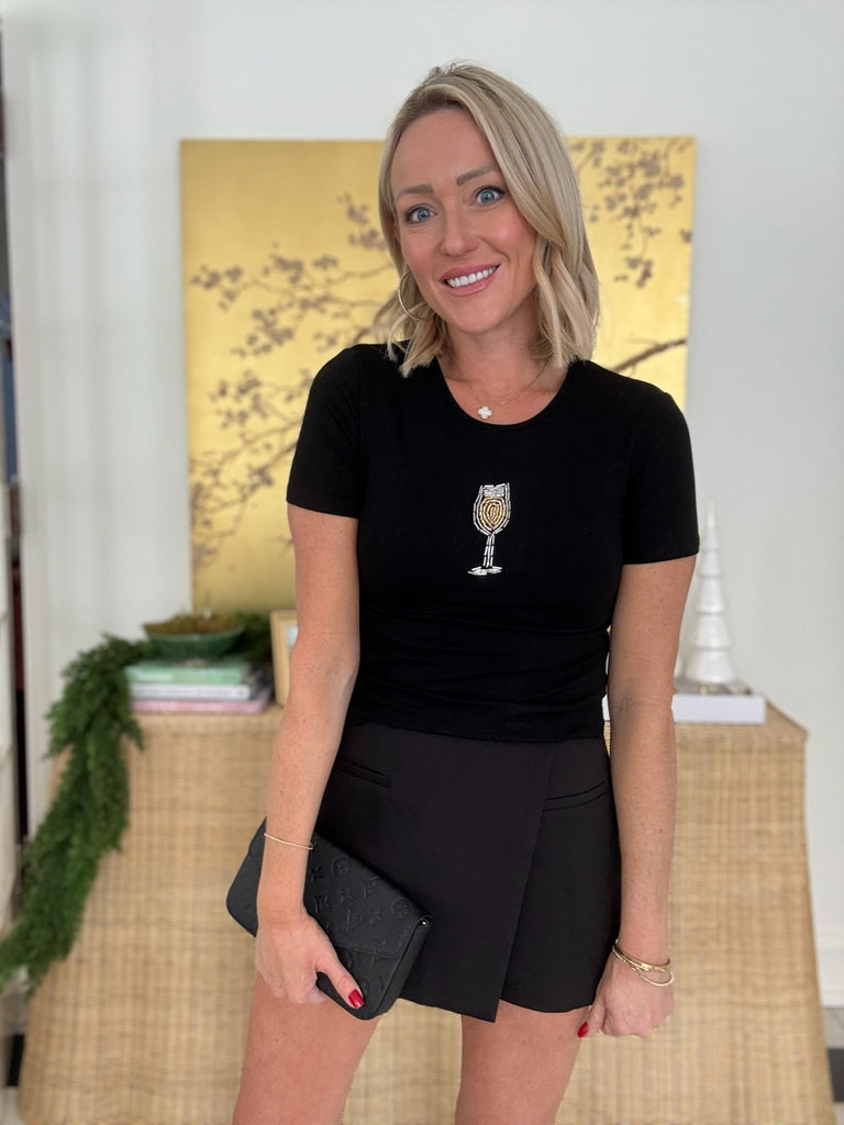 Sip in style with the Champagne Problems Tee! This classic black tee features short sleeves, cropped hemline and champagne flute beaded embellishments.