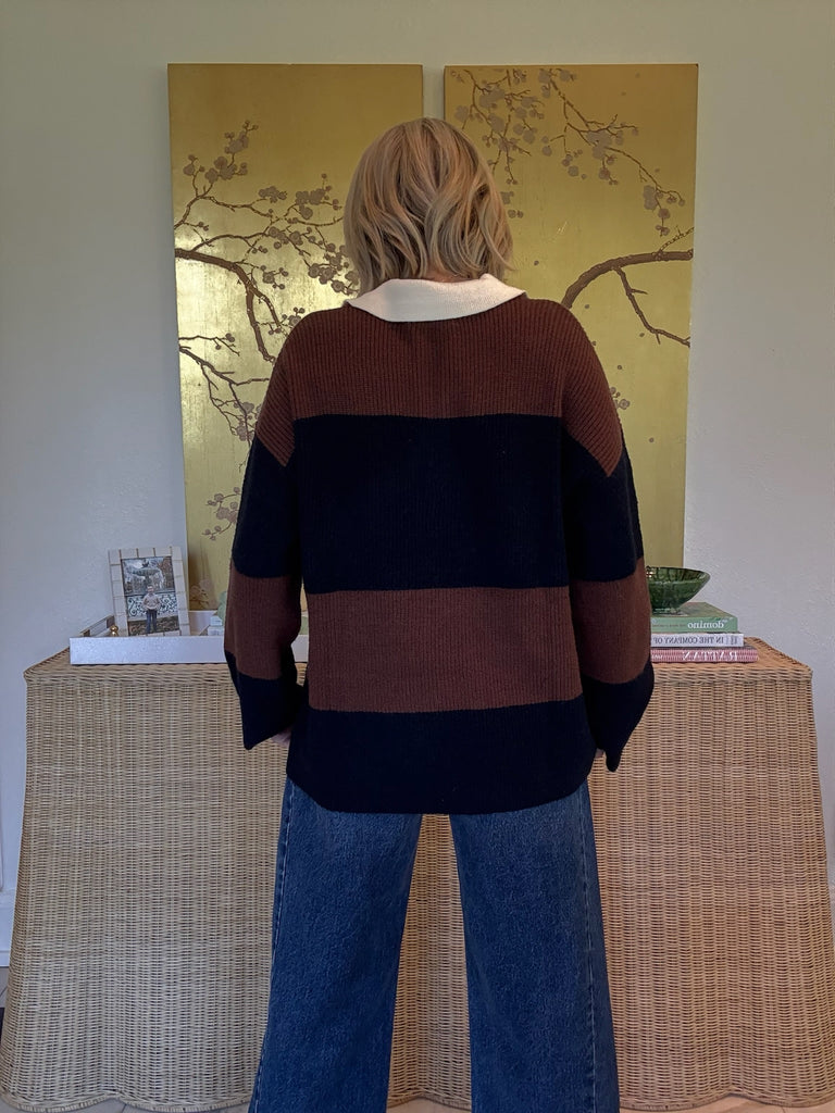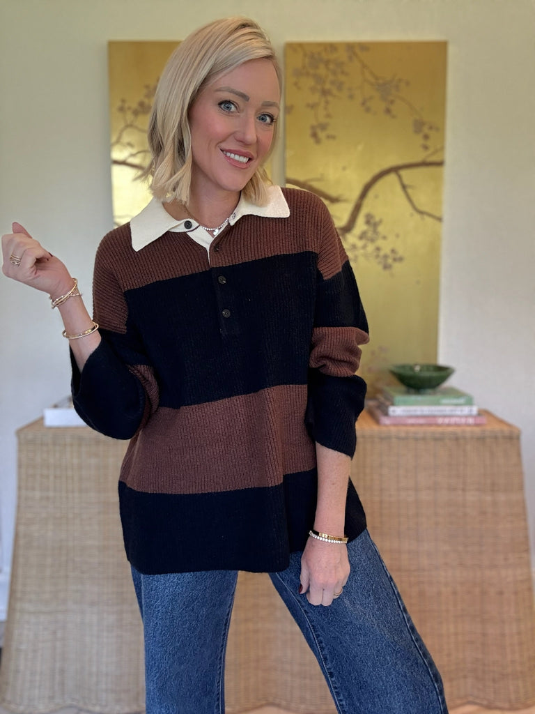 The Conrad Collar Polo Sweater is 100% your look! Wit its chunky stripes, collared neckline and long sleeves this piece will be getting all the compliments.