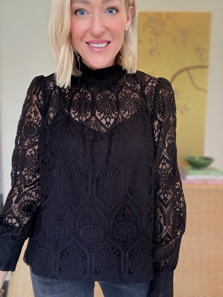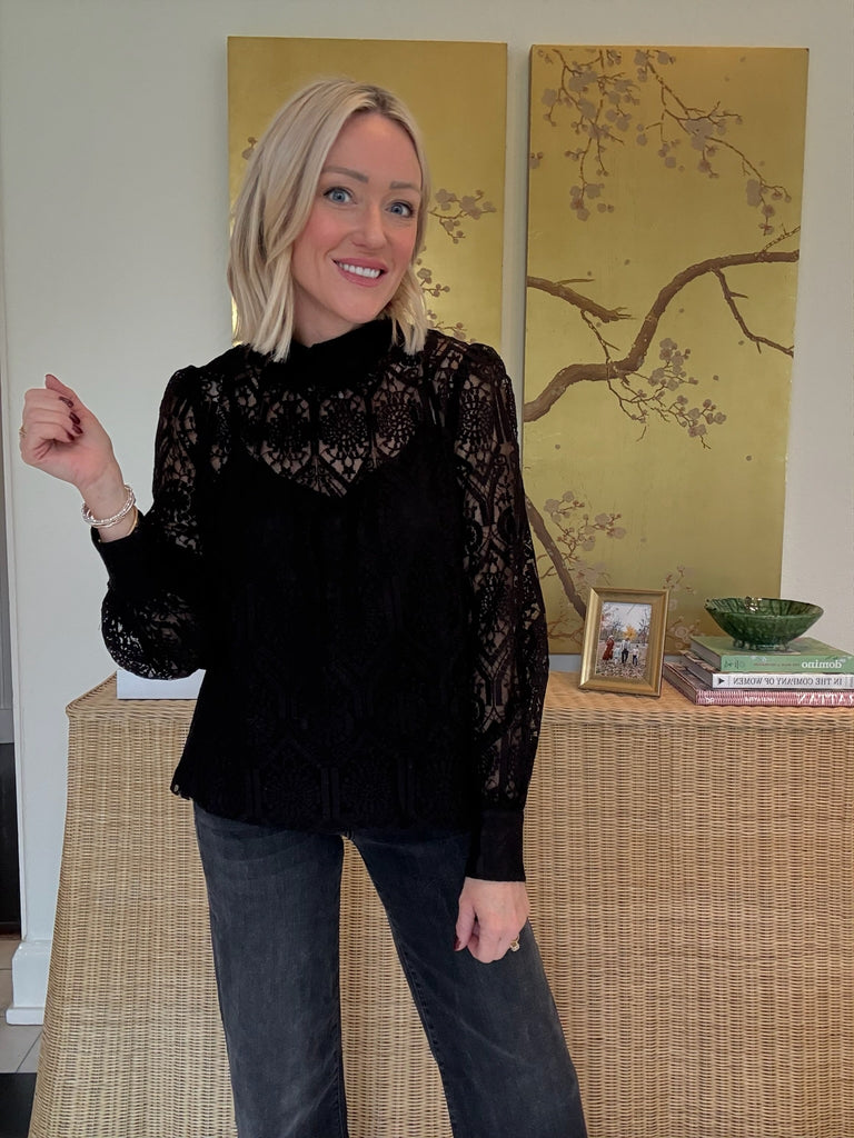 Show off your saucy side in the Felicity Lace Blouse. This black top with lace overlay shapes this long sleeved blouse with high neckline and standard hem. Style with your favorite jeans or skirt for many ways to wear.