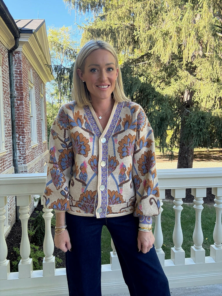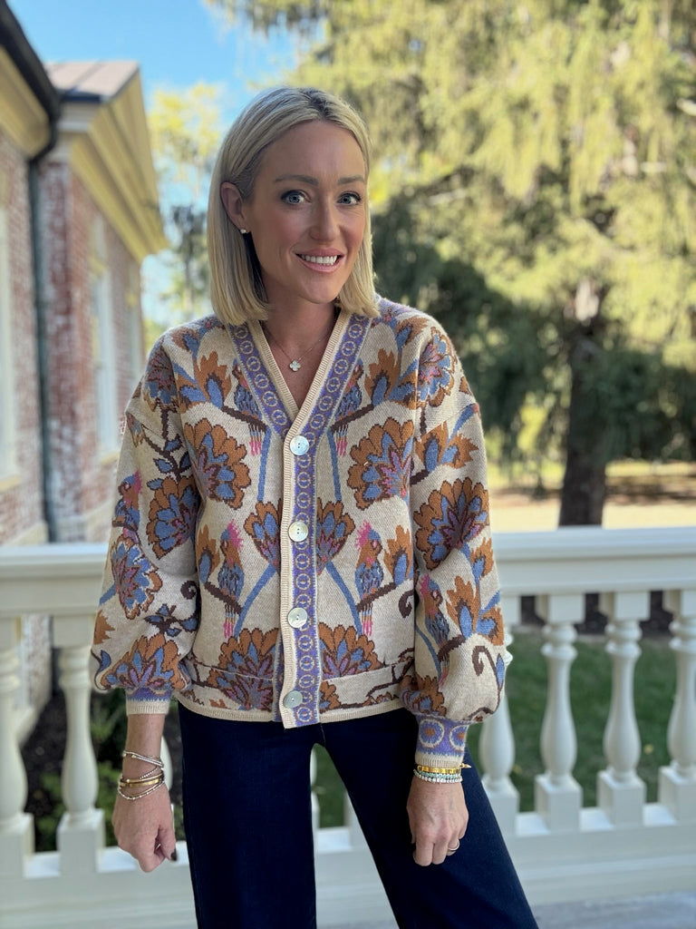 Take florals to a new level with the Jackie Floral Knit Cardigan. This jewel toned floral knit features long sleeves and an open front. Style with your favorite denim for an easy breezy look. Model advice: fits true to size