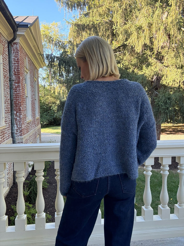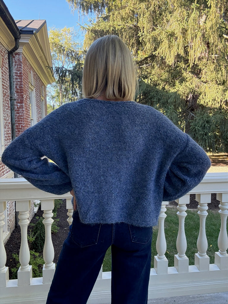 The Kallie Button Sweater is so soft you'll be wanting to wear it over and over again! With its plush blue knit long sleeves and button front closures this piece is a must have!