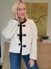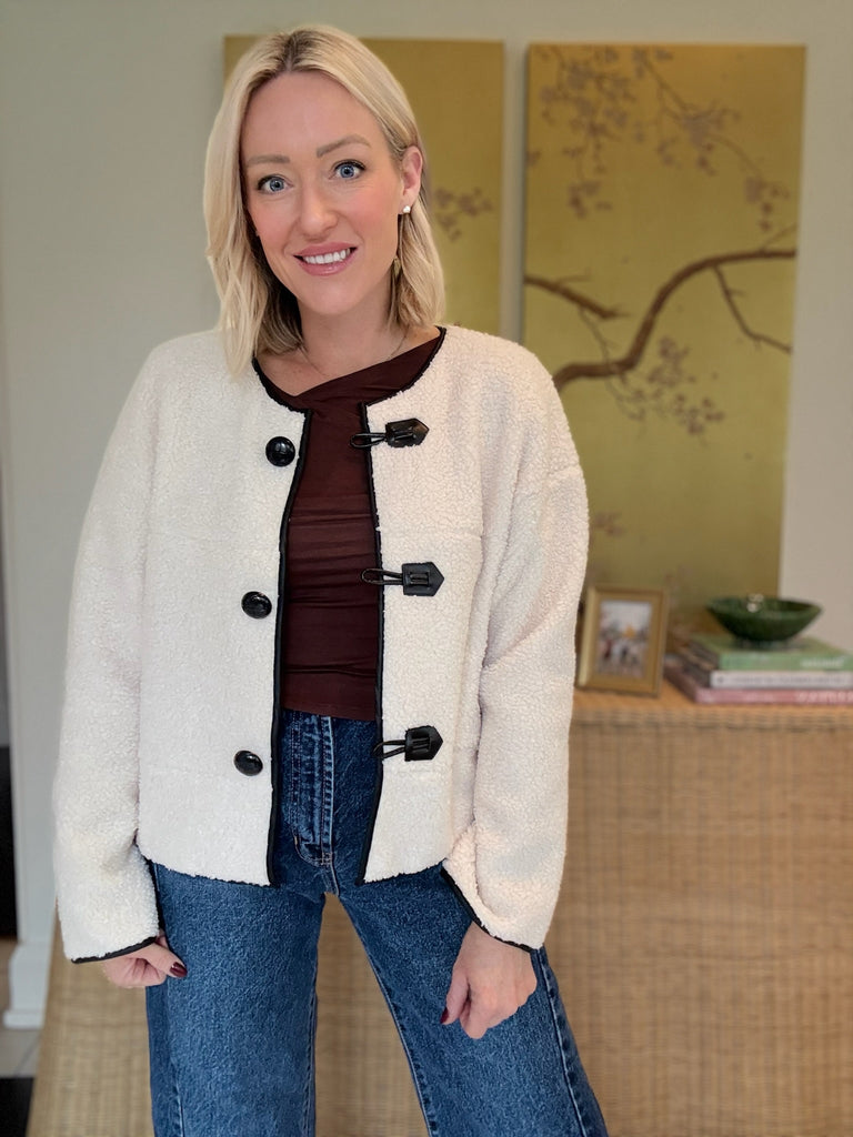 Layering has never looked better than it does with the Rachel Sherpa Jacket! This white sherpa jacket features long sleeves, cropped button hemline and latch front closures with black accents and trim.