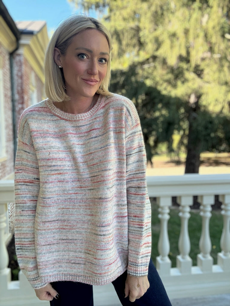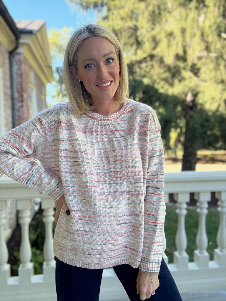 Add a pop of  color with the Sundae Speckled Sweater! This cream knit with multicolored threaded stripes throughout features long sleeves and longer hemline. Dress up or down to match any event!
