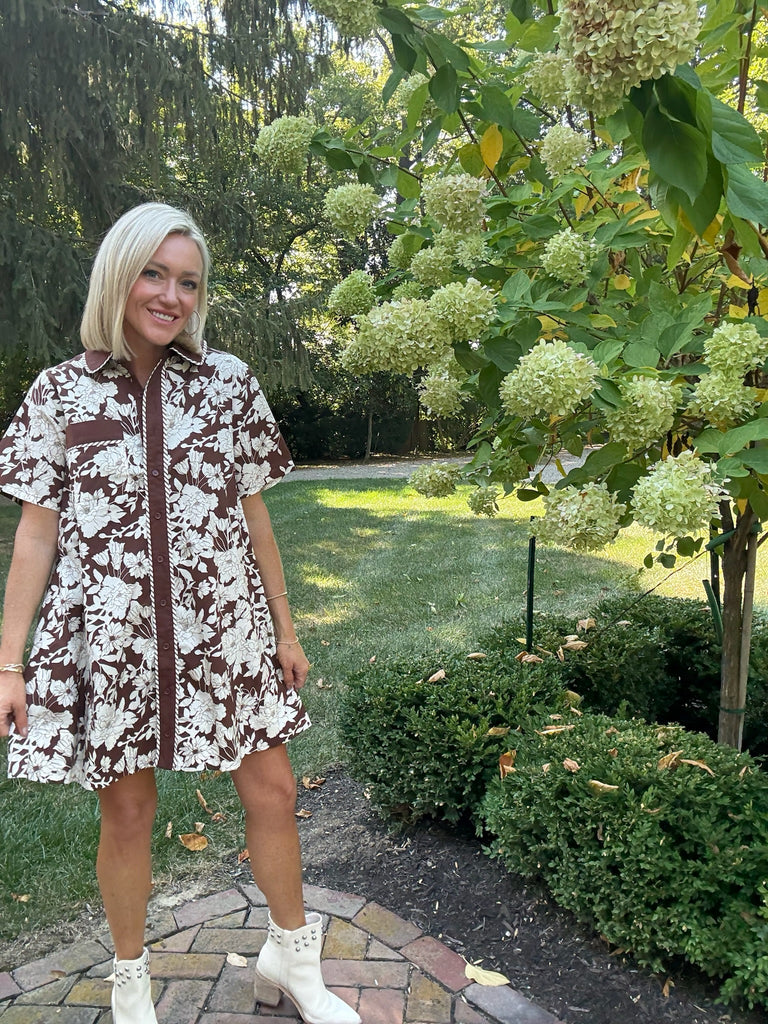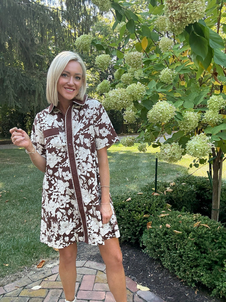 We are loving the brown floral print of the Wallace Button Dress! This brown and cream floral mini features a collared neckline that falls into front hidden buttons, and short sleeves. Dress up or down to match any occasion.